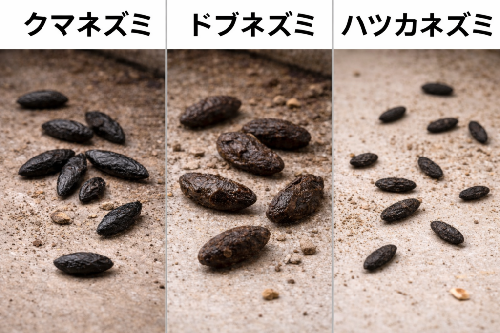 • 場所:屋根裏・ベランダ隅・屋外の決まった場所にフンをためることも